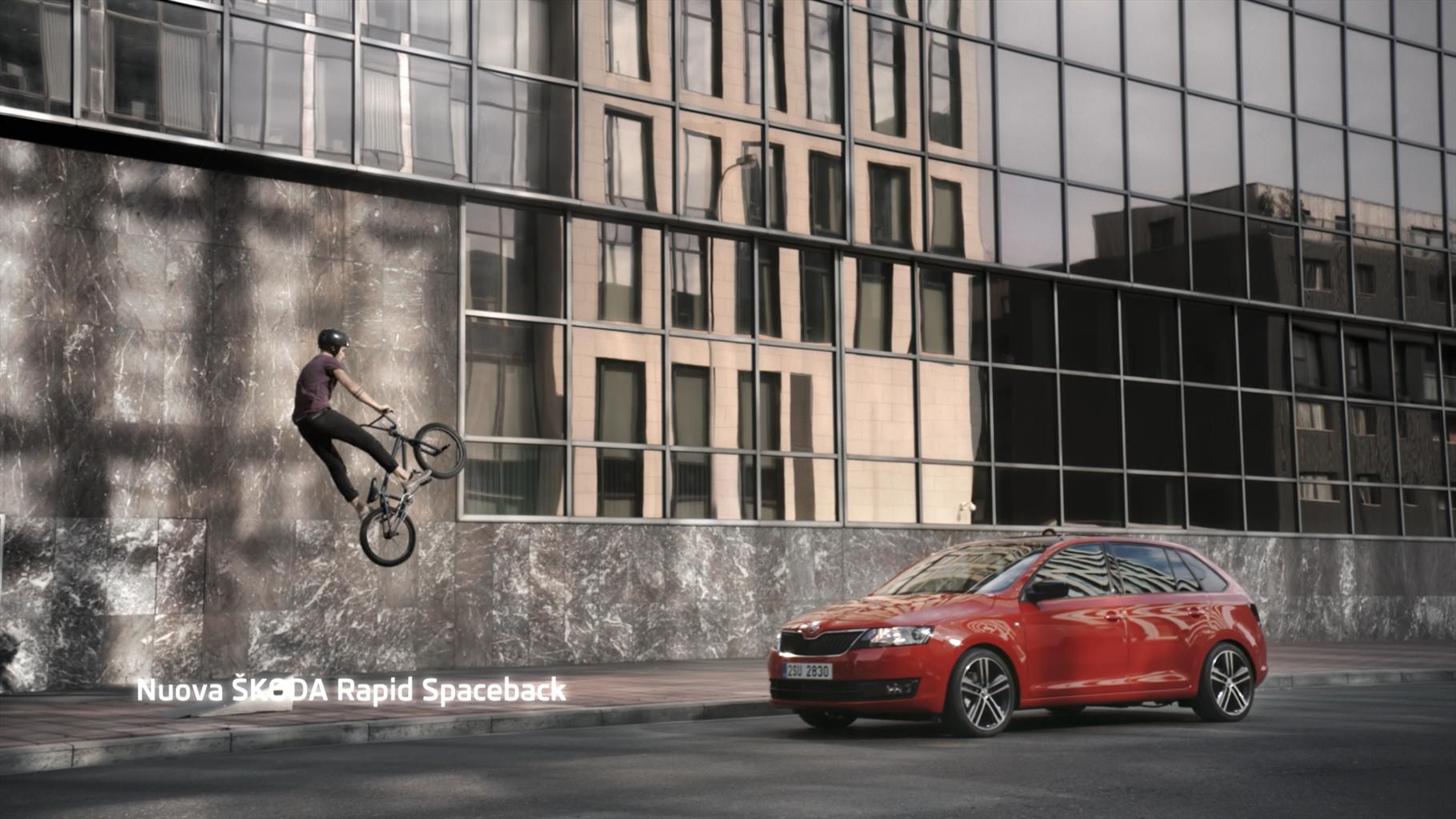 “Space is a feeling” è il claim proposto nel commercial e nei materiali di promozione adattati dall’agenzia Cayenne, che richiama sensazioni fisiche precise: una città moderna vissuta in slow motion, dove i giovani possono percepire le potenzialità di gesti comuni e non, librandosi in aria e cogliendo la potenza di uno spazio illimitato a disposizione. L’evoluzione dei loro movimenti ginnici riprodotti al rallentatore importa nello spot il concetto di bellezza lineare, lo stesso espresso dalla Rapid Spaceback.
